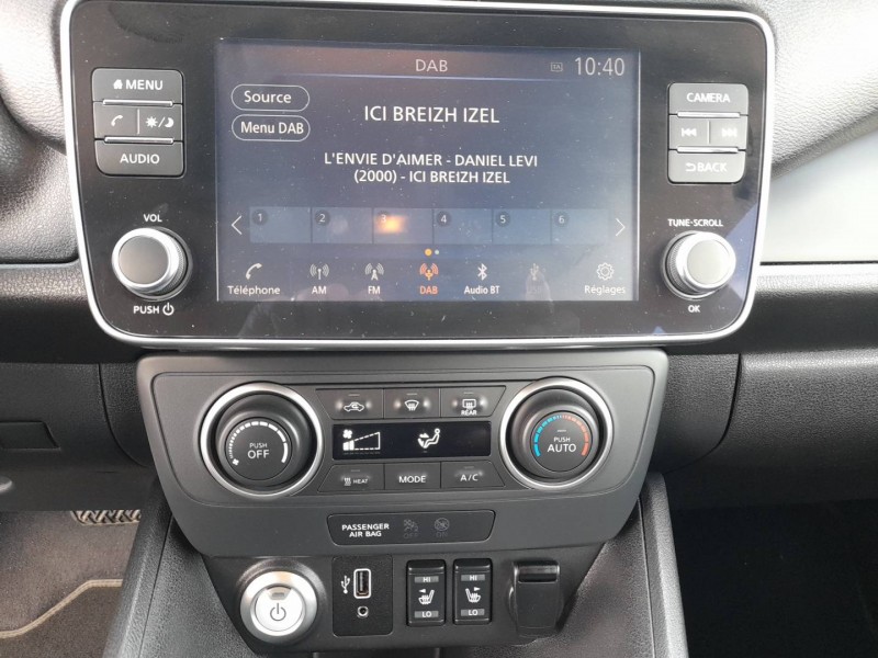 - Nissan Connect 7.0" : Ecran tactile couleur 7,0", Caméra de recul avec repères de gabarit dynamiques Pilotage des services télématiques, Indication des points de charge avec mise à jour automatique, Système de navigation multimédia avec fonction Info Trafic, cartographie Europe 3D, indicateur d'éco-conduite, Système audio Bluetooth® (téléphone et musique), Radio numérique DAB, Connexion smartphone (Apple CarPlay et Android Auto)