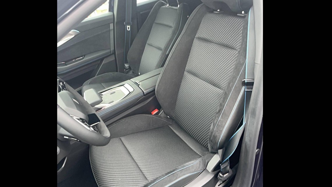 - Sellerie mixte tissu carbone / alcantara avec surpiqûres bleues